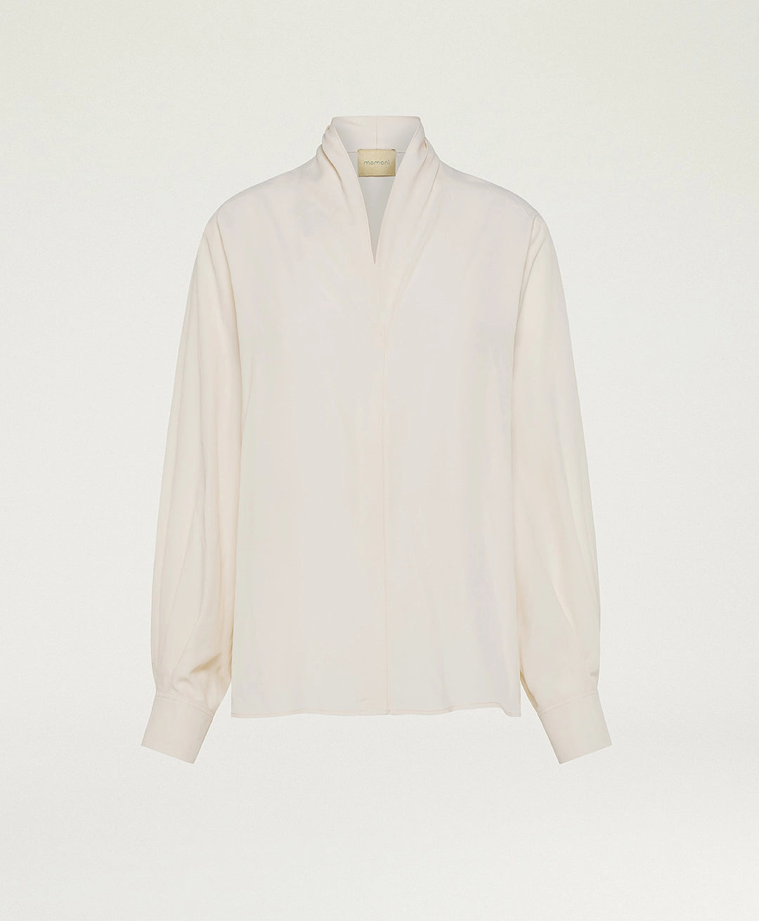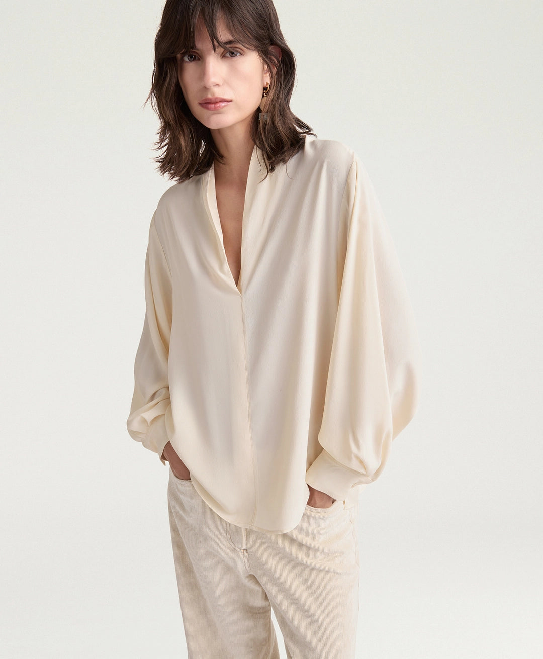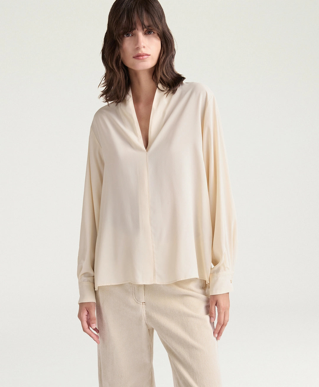 Blusa a manica lunga in morbido crêpe misto seta. Il fit comfort di "Margaret" si sposa armoniosamente al morbido scollo a V drappeggiato ed alla ricca manica con pieghe al fondo rifinita con un elegante polso ad anello.