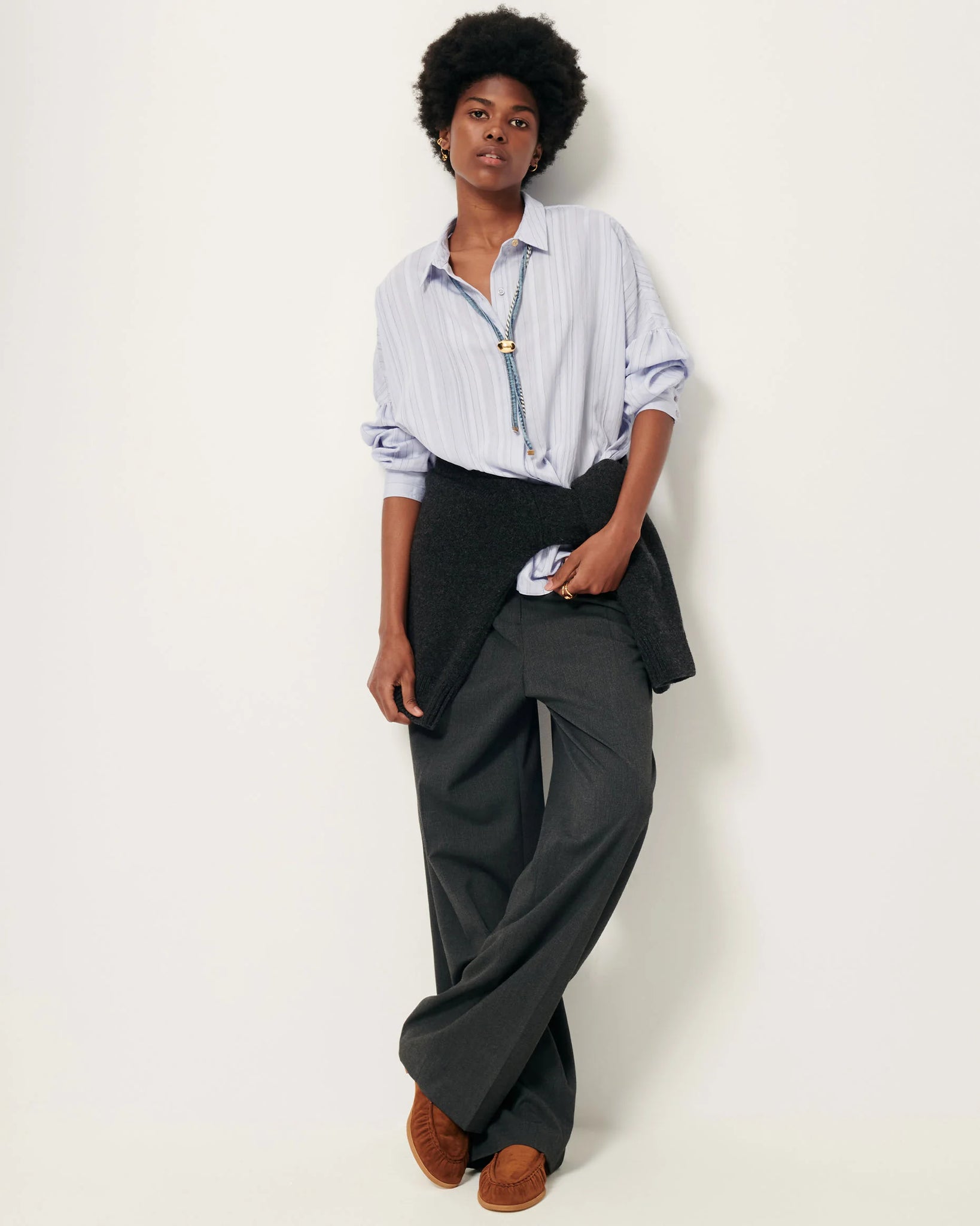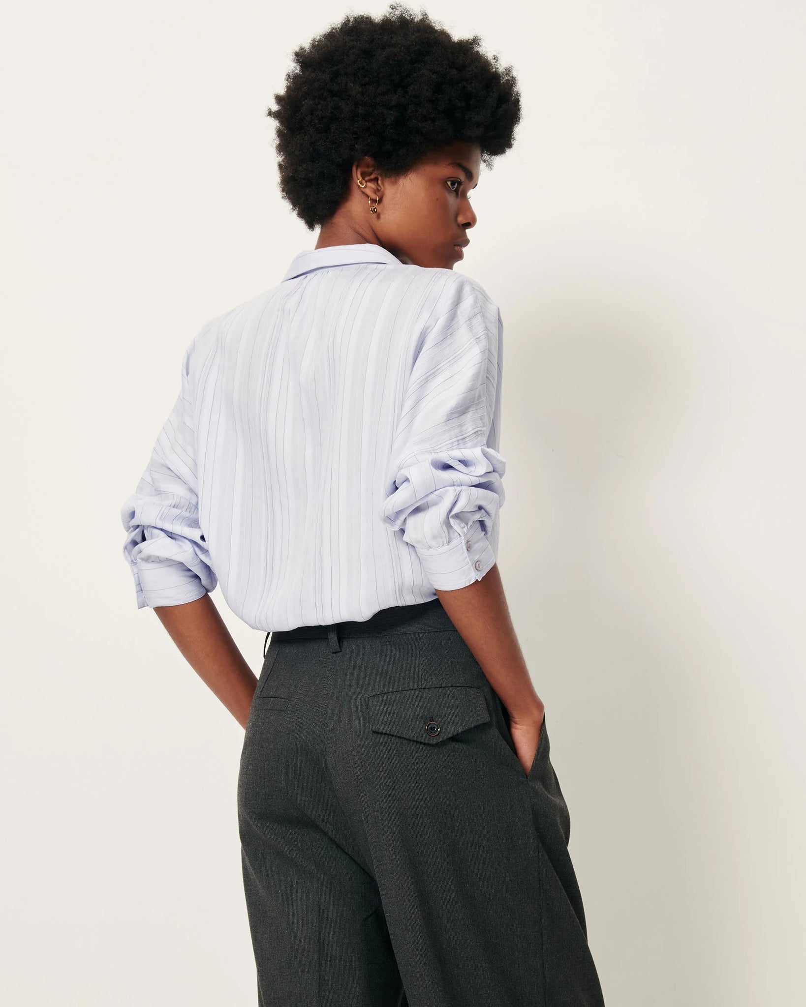 Camicia con spalle scese arricciate in percalle di viscosa leggero con righe dobby.