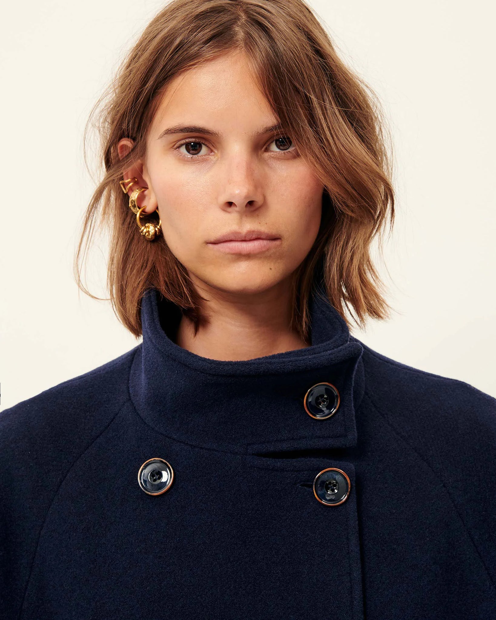 Collo alto con abbottonatura.