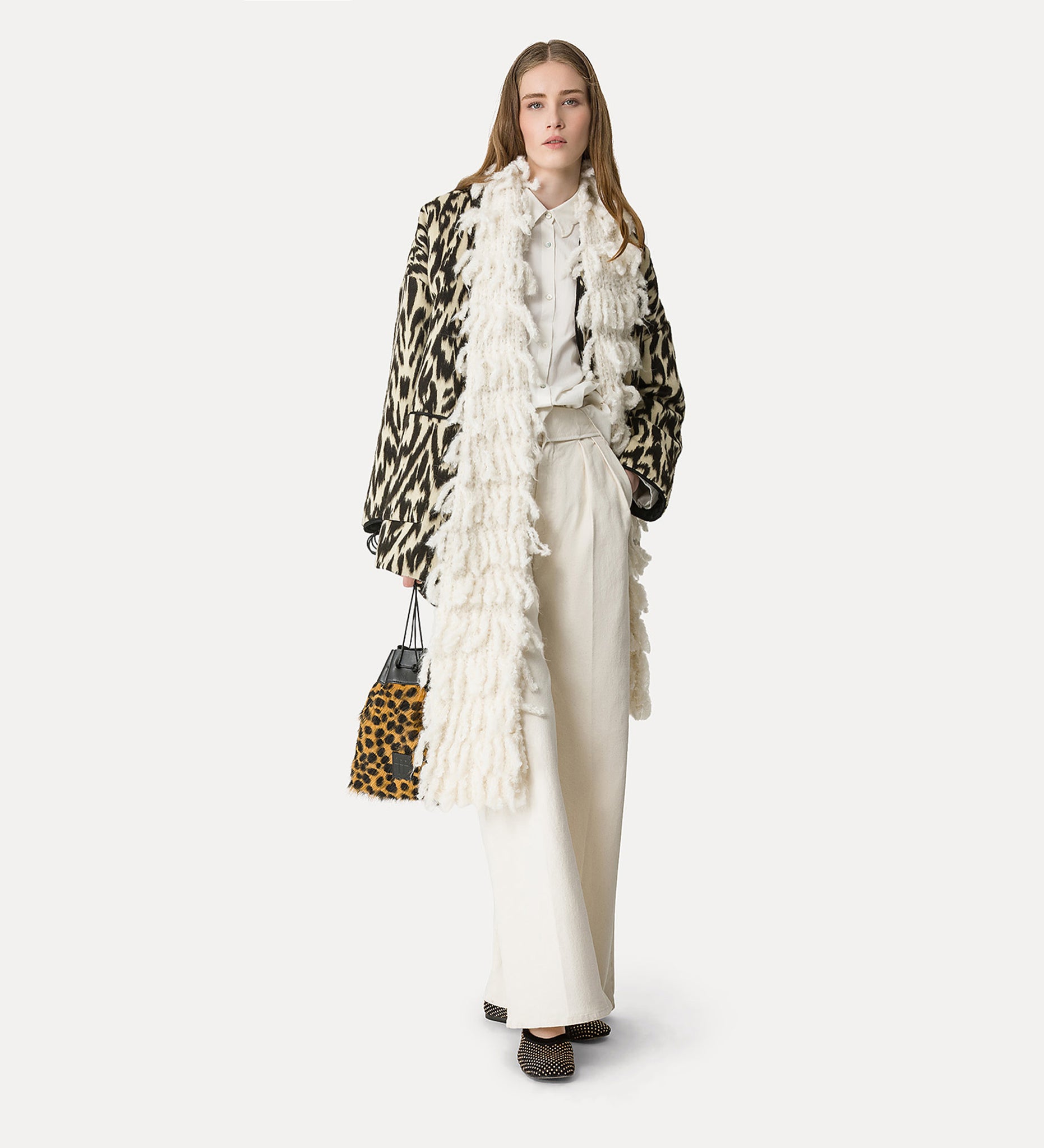 Con le sue forme morbide e destrutturate, questo giaccone in panno jacquard “moiré” rimane in equilibrio tra il carattere deciso della fantasia e i volumi décontracté. I bordi in passamaneria a contrasto, il fondo asimmetrico con spacchetti stondati e la tasca applicata addolciscono l'importanza del panno in lana e cotone, con legatura in seta.