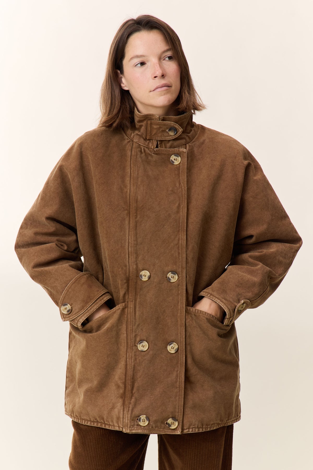 Il cappotto Viktor Plain incarna lo spirito di Leon & Harper, con un taglio dritto che modella la silhouette senza costrizioni. Il design doppiopetto, impreziosito da grandi bottoni, crea un look deciso, mentre il collo alto regolabile consente di scegliere tra diversi stili a seconda dell'umore. Le tasche applicate e i polsini con bottoni riflettono una particolare attenzione ai dettagli nelle finiture. Realizzato in 100% cotone, il capo offre un drappeggio preciso e un comfort quotidiano autentico. Indossalo sopra un abito ampio o con pantaloni aderenti per un mix urbano e rilassato.