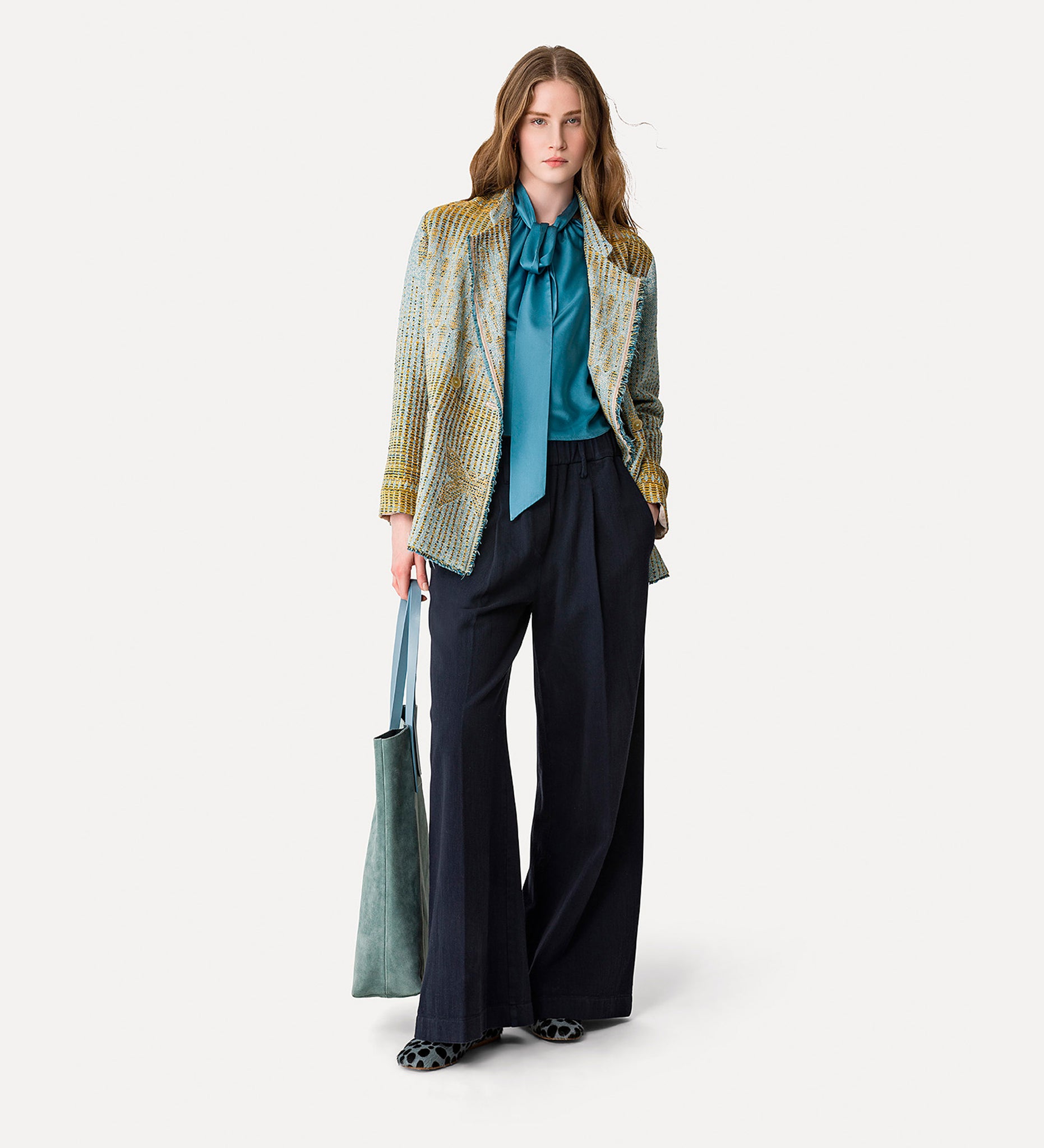 Fantasia scintillante come i raggi che rimbalzano sulle ali delle libellule, questa over jacket jacquard “libelle” porta con sé leggerezza, poesia e una nota artigianale. Sfrangiata a mano, la giacca oversize jacquard è completata da dettagli in velluto a contrasto, per un mix soave tra allure urbana e preziosità.