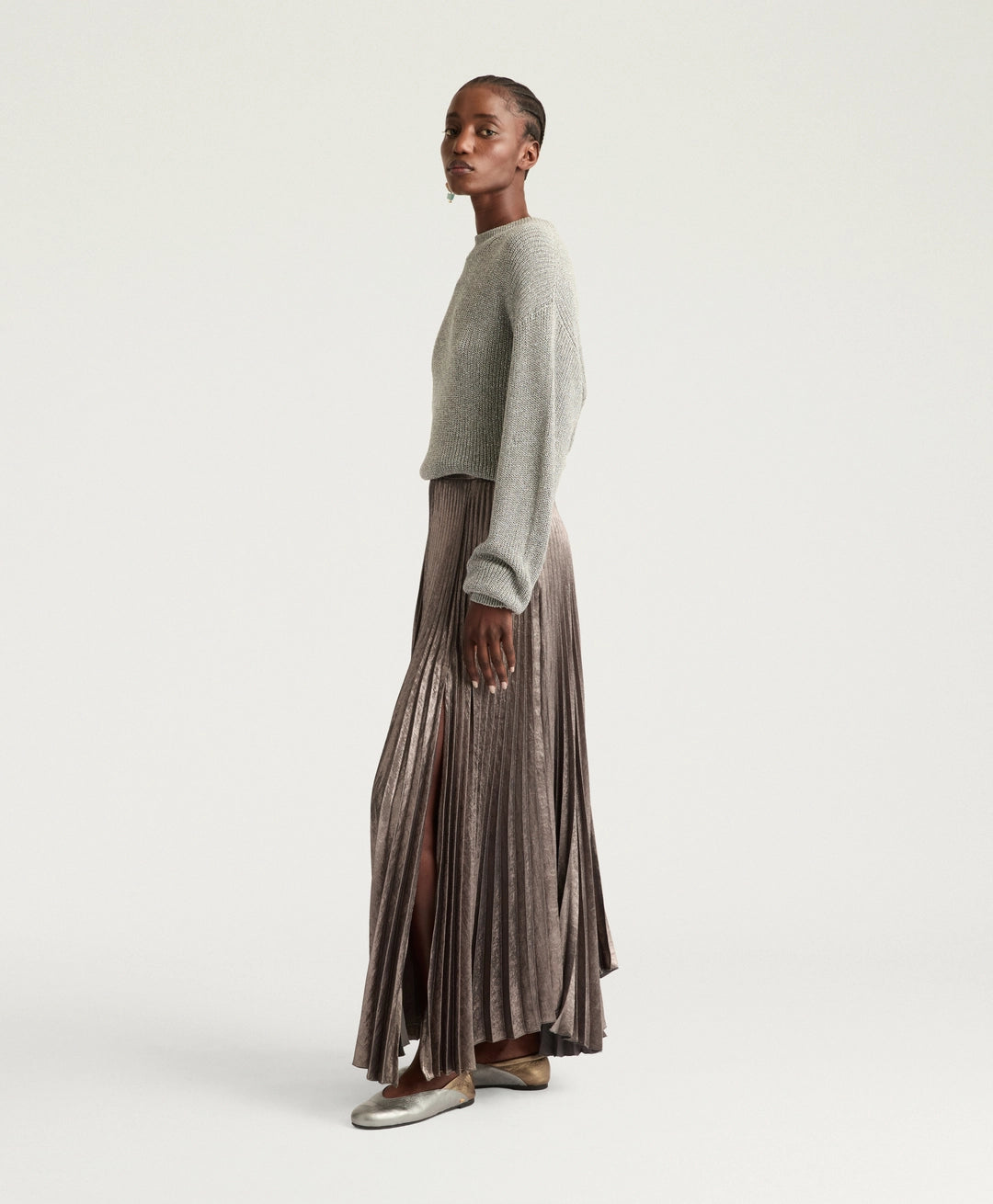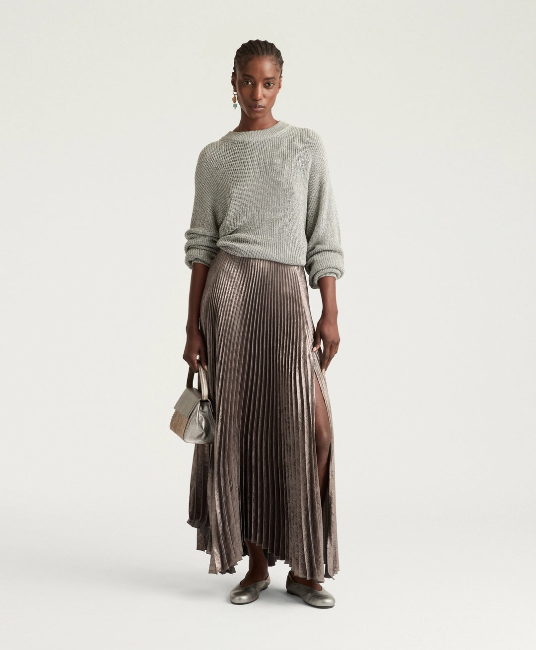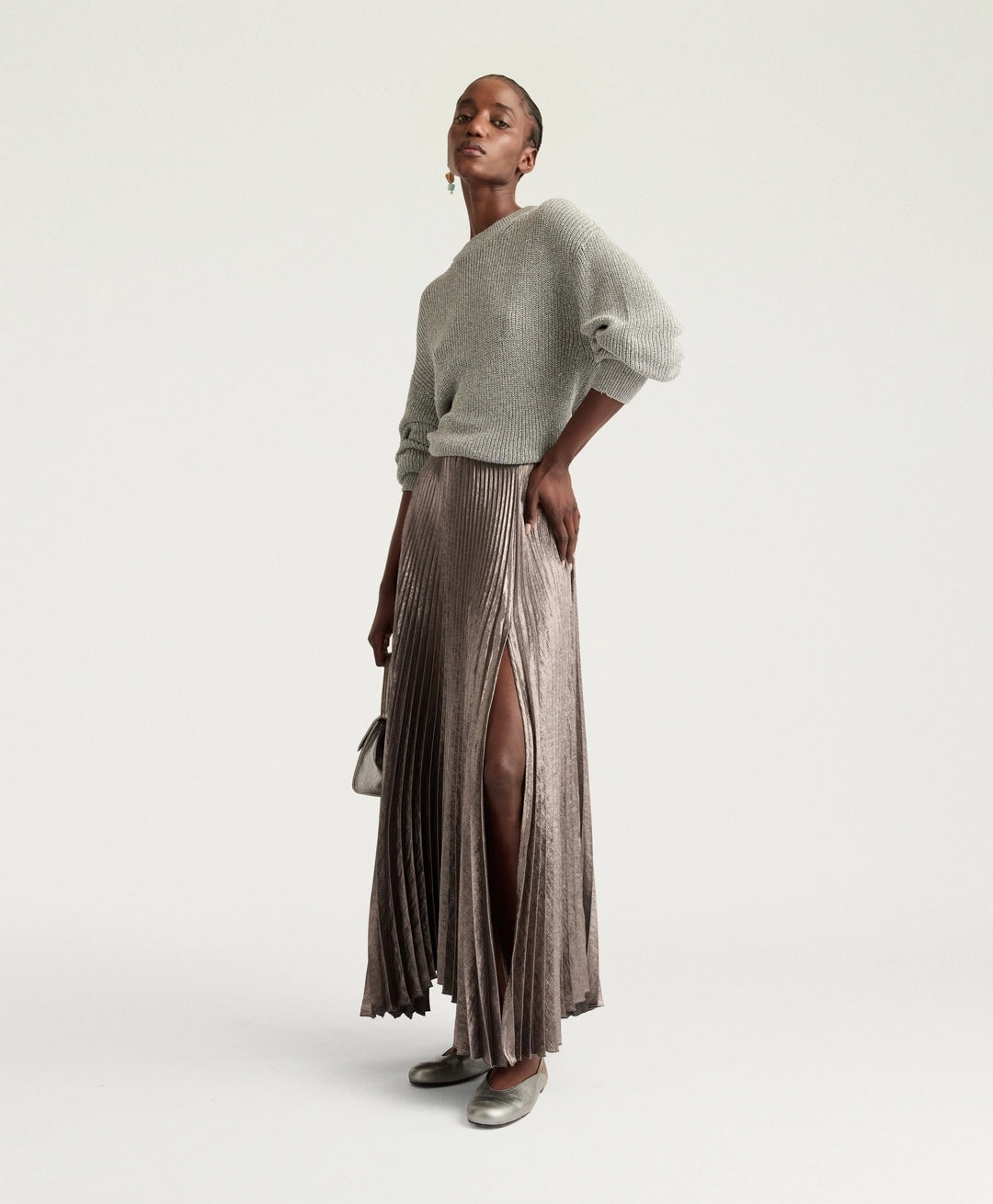 Gonna luga plissettata in tessuto fluido laminato. Luce in movimento. "Lily" unisce la ricchezza del plissè soleil alla leggerezza sensuale del suo spacco asimmetrico. Rifinisce il modello l'elegante cinturino in vita.
