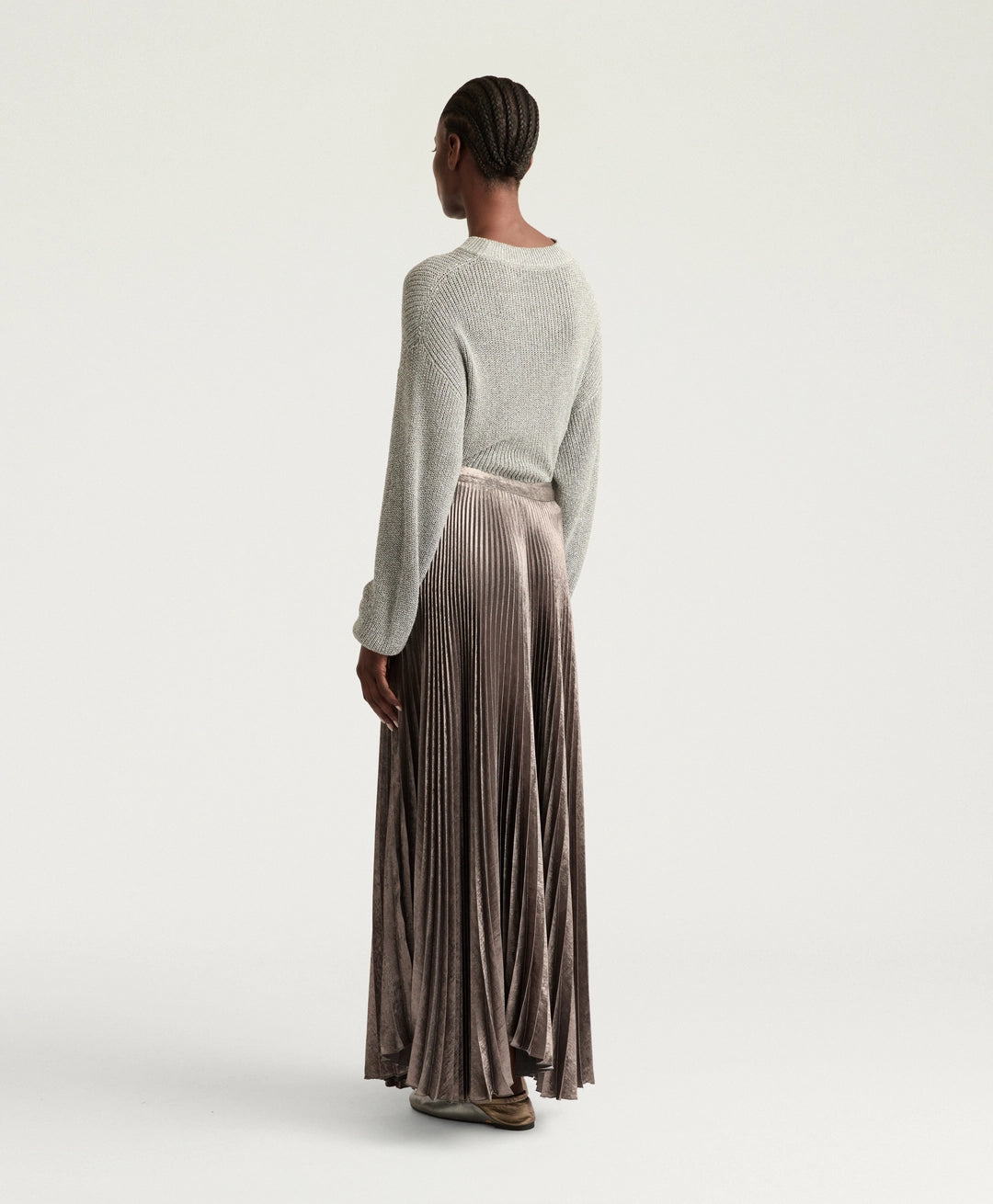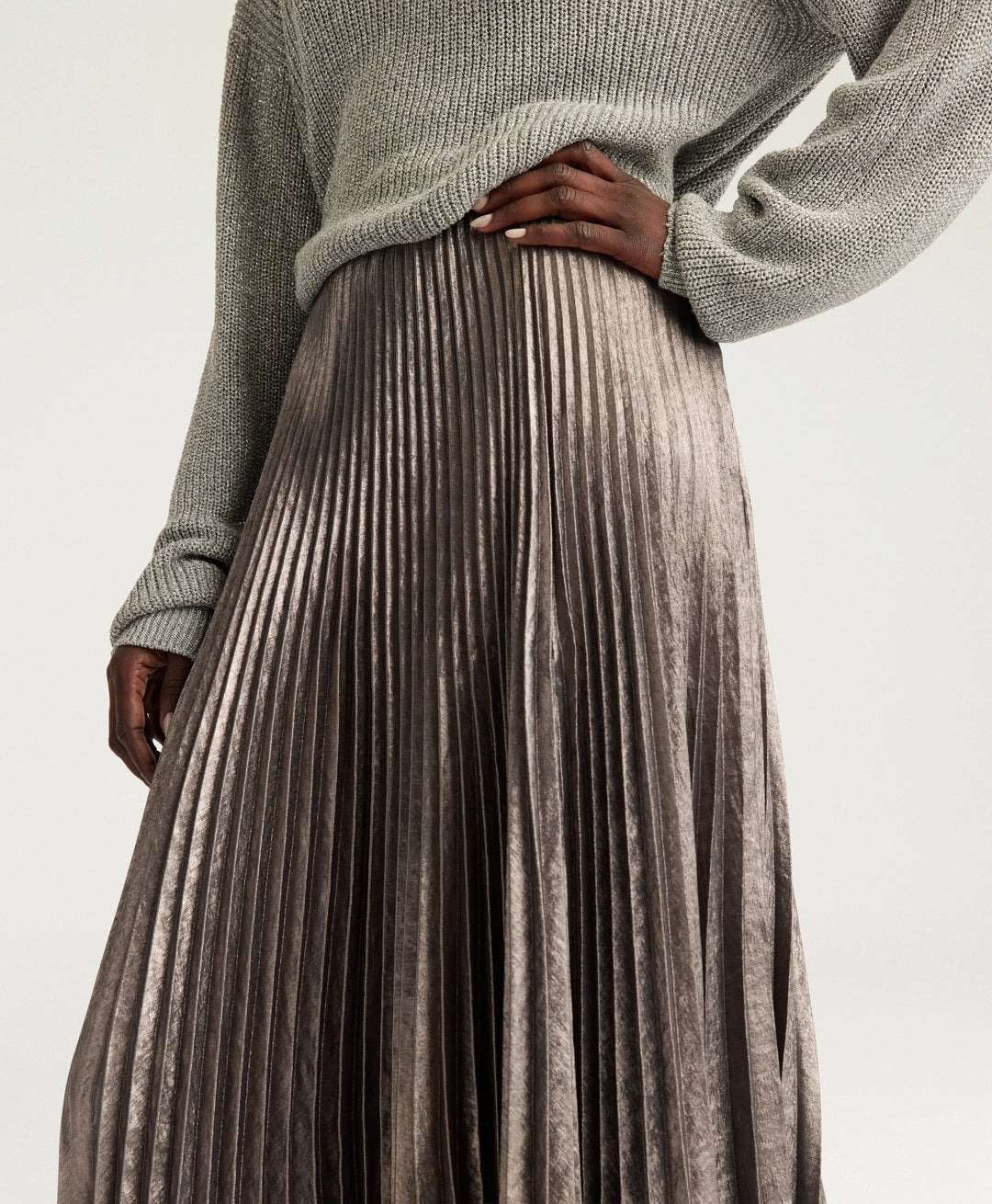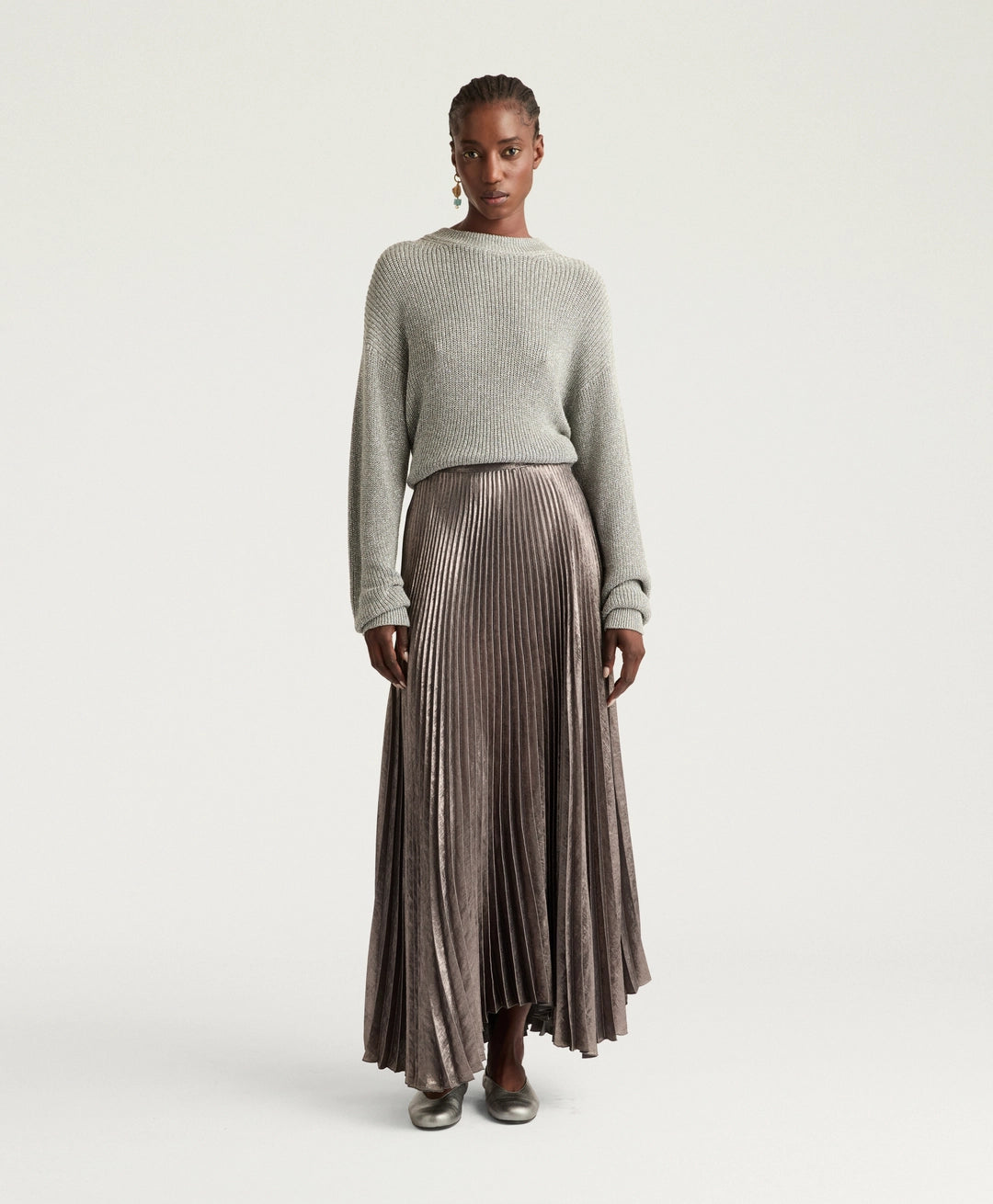 Gonna luga plissettata in tessuto fluido laminato. Luce in movimento. "Lily" unisce la ricchezza del plissè soleil alla leggerezza sensuale del suo spacco asimmetrico. Rifinisce il modello l'elegante cinturino in vita.
