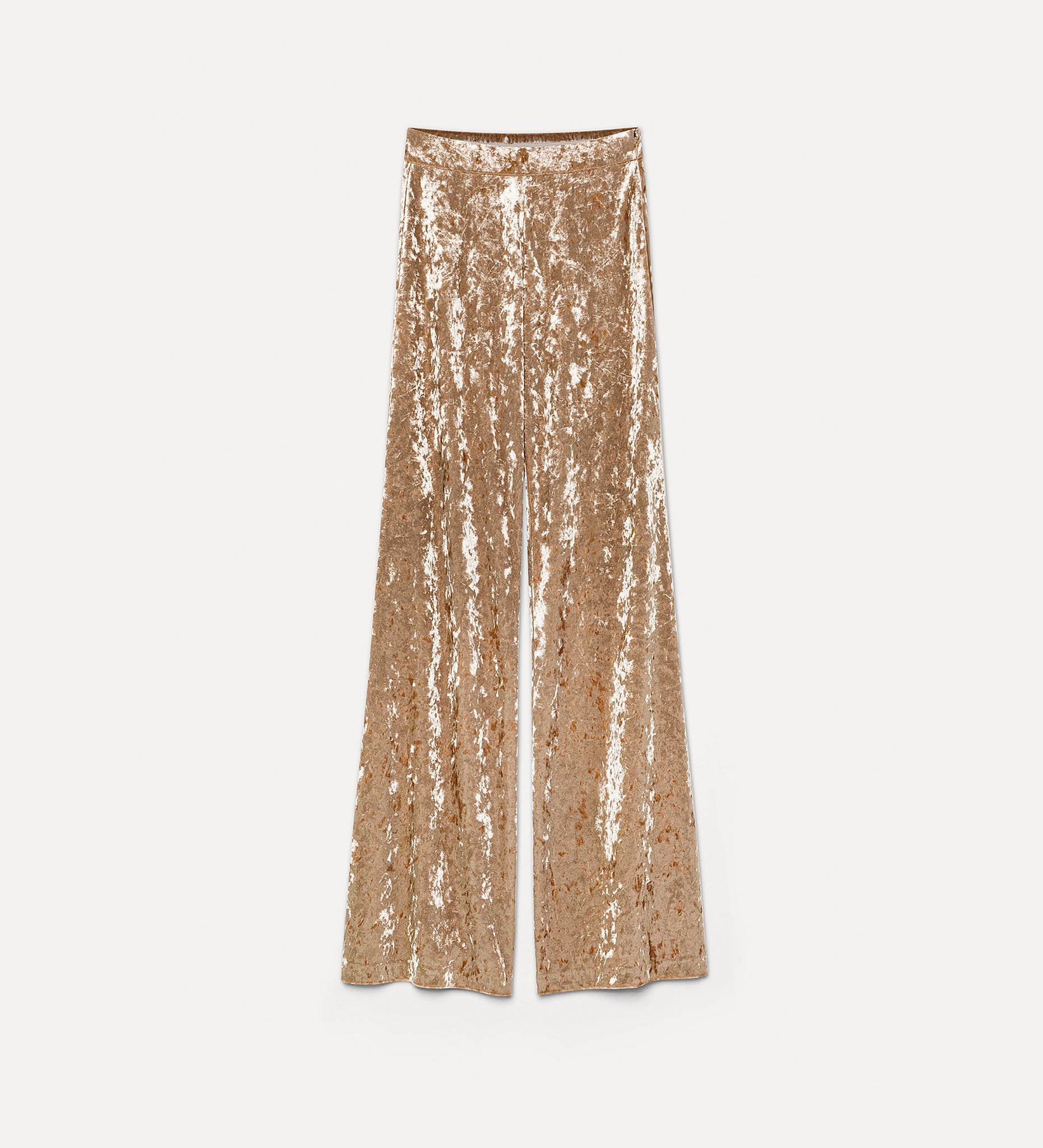 Con le sue linee delicatamente flare la fondo, il pantalone in velluto cangiante leggermente martellato accompagna le giornate con un finish luminoso. Soffice e setoso al tatto, ha vita alta per una silhouette slanciata.