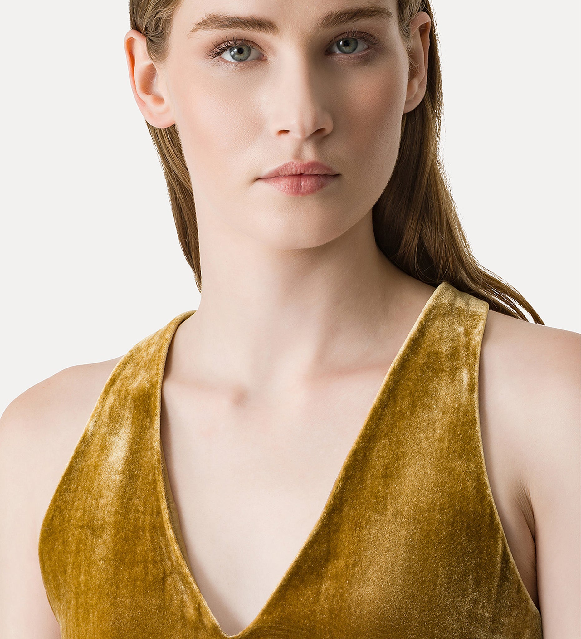 Spalle scoperte e ampia apertura sul davanti, il top con scollo a v in velluto liscio carezza la pelle con la morbida fluidità del tessuto in seta e viscosa. Lussuoso alla mano, ha un effetto dolcemente cangiante che illumina ogni look.